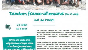 Du 24 juillet au 7 août 2022 Séjour Tandem linguistique et interculturel pour les jeunes de 14 à 17 ans Pour la quatrième année, nous avons le plaisir de coorganiser notre séjour linguistique franco-allemand La méthode Tandem, qu'est ce que c’est ? C'est une méthode...